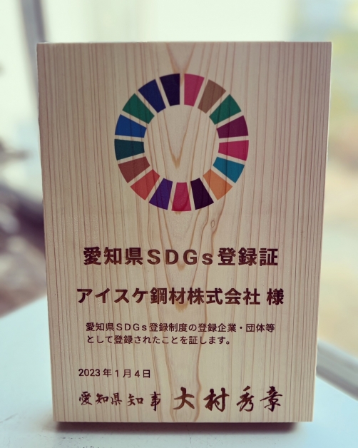 2023.02.13 SDGs登録証 愛知県よりSDGsの登録証が届きました。 愛知県のSDGs登録企業としてアイスケ鋼材が登録されました。 今後も持続可能な社会活動・経済活動に引き続き取り組んで参ります。