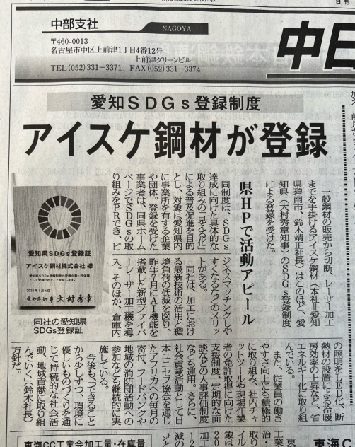 2023.02.22 産業新聞に掲載【愛知SDGs登録】 2023年2月20日付けの産業新聞に当社記事が掲載されました。愛知県のSDGs登録制度に登録した内容です。 環境負荷の少ないファイバーレーザー加工機での加工のこと、従業員の働く環境や働きやすさ向上に取り組んでいること、社会貢献・地域貢献に取り組んでいることなどを記事にしていただきました。 アイスケ鋼材では引き続きできることから少しずつ、持続可能な経済活動・社会活動・地域貢献に取り組んでいきます。