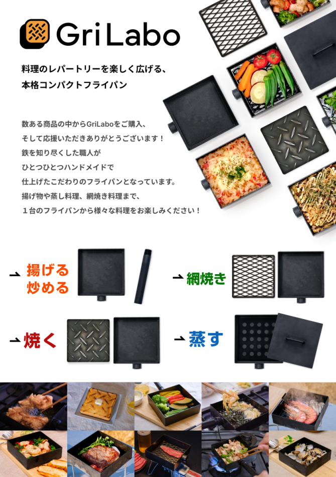 何度も試作を繰り返し、弊社オリジナル商品である鉄製コンパクトフライパン「GriLabo」(グリラボ)を開発することが出来ました。