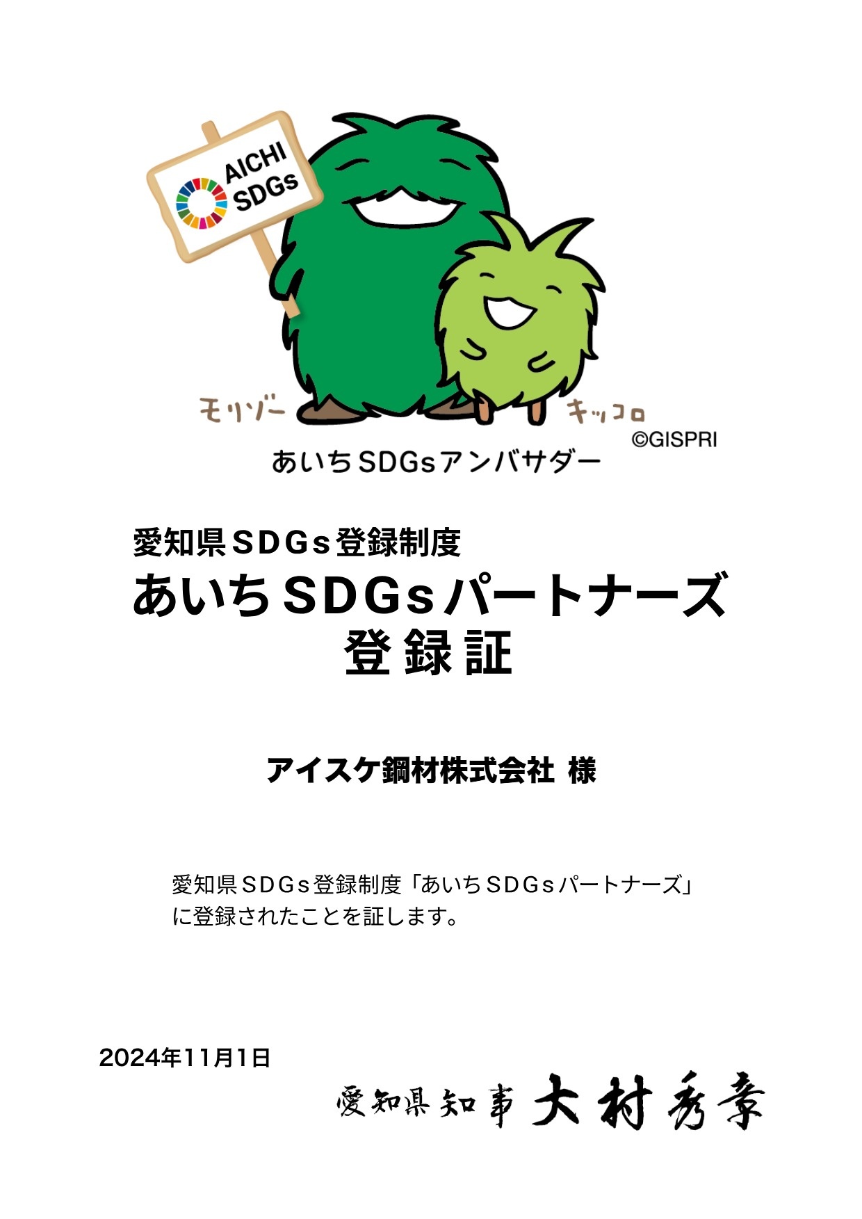 愛知県のSDGs登録制度「あいちSDGsパートナーズ」に登録していただきました。